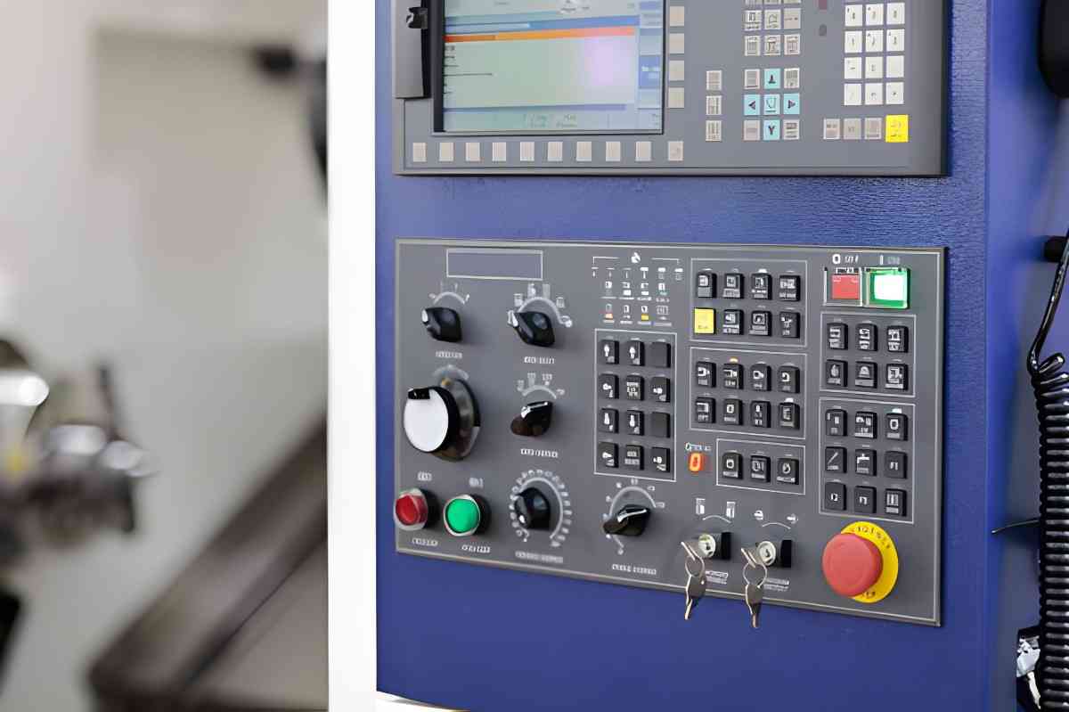 Image Description: A milling machine control panel with buttons and a display used to operate and monitor machining functions.