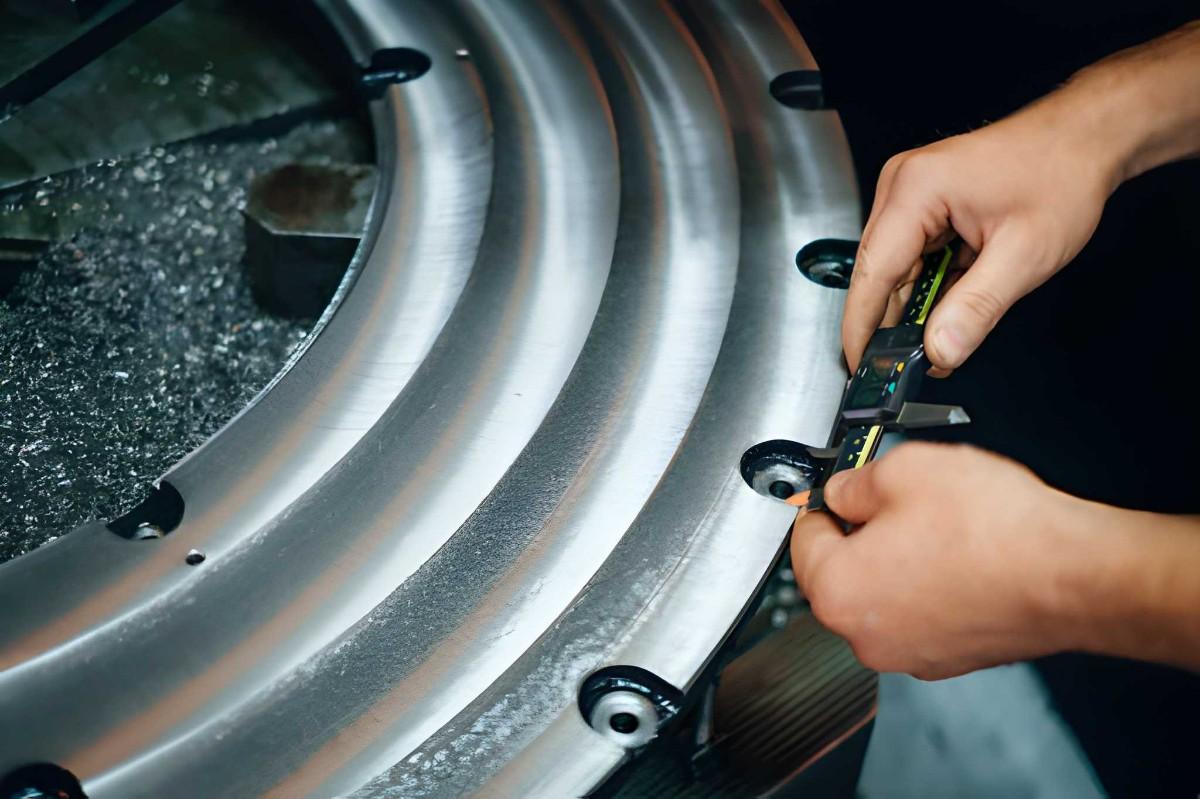 Image Description: A close-up photo shows a machined metal part with clean circular holes. An Engineer measuring dimensions using calipers highlights the hole sizes on the actual metal surface.