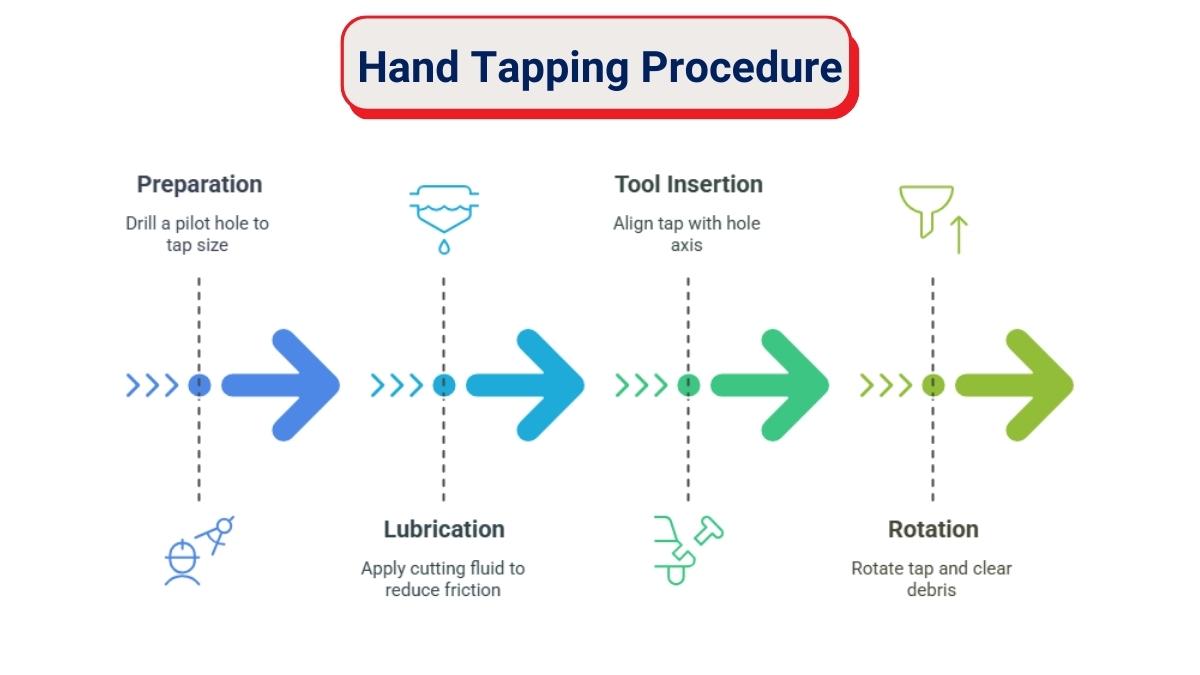 Image Description: An image showing the step-by-step procedure of the hand tapping process. The sequence begins with a secured workpiece, followed by drilling a hole. Next, the hole is chamfered, and a tap is aligned using a tap wrench.