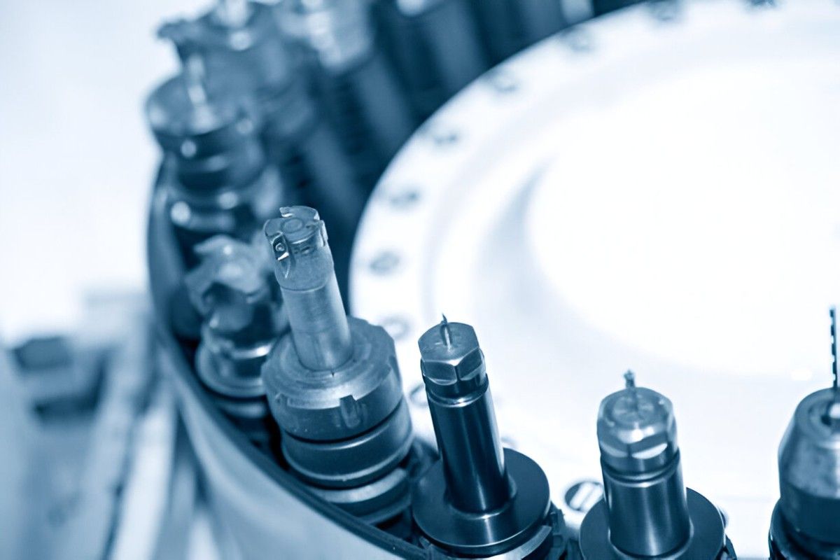 Image Description: Various CNC milling tools in the magazine, including ball, flat, and radius end mills, as well as drills, during a tool changeover.