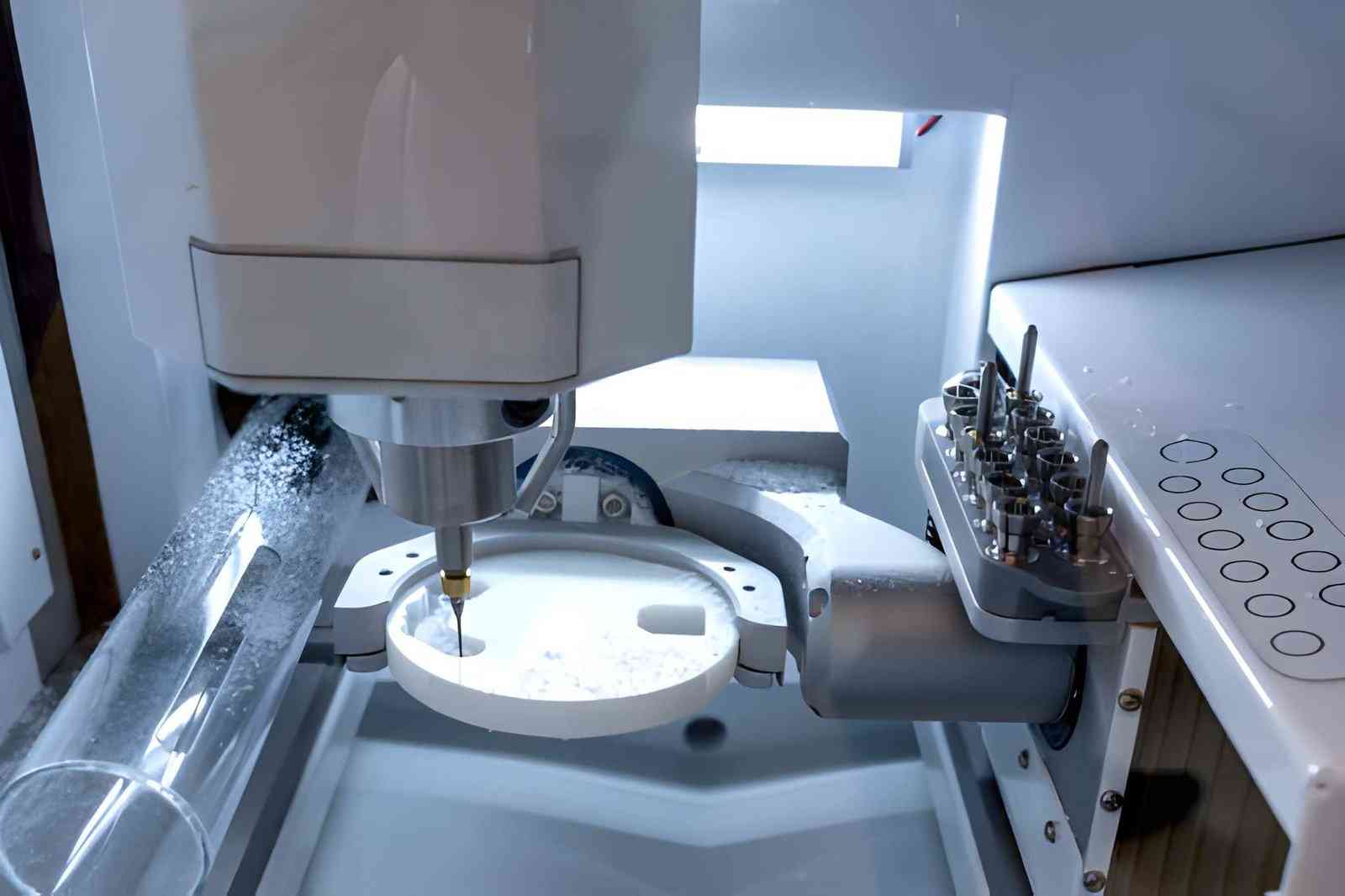 Image Description: The image shows a dental CAD CAM system used to machine ceramic dentures. The device precisely mills ceramic blocks to produce dental restorations with accurate shape and fit.