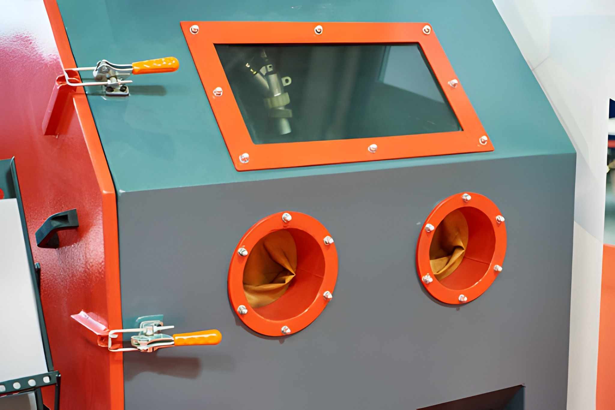 Image Description: Here, the image displays an industrial bead blasting chamber designed for precision surface finishing and dust-free operation.