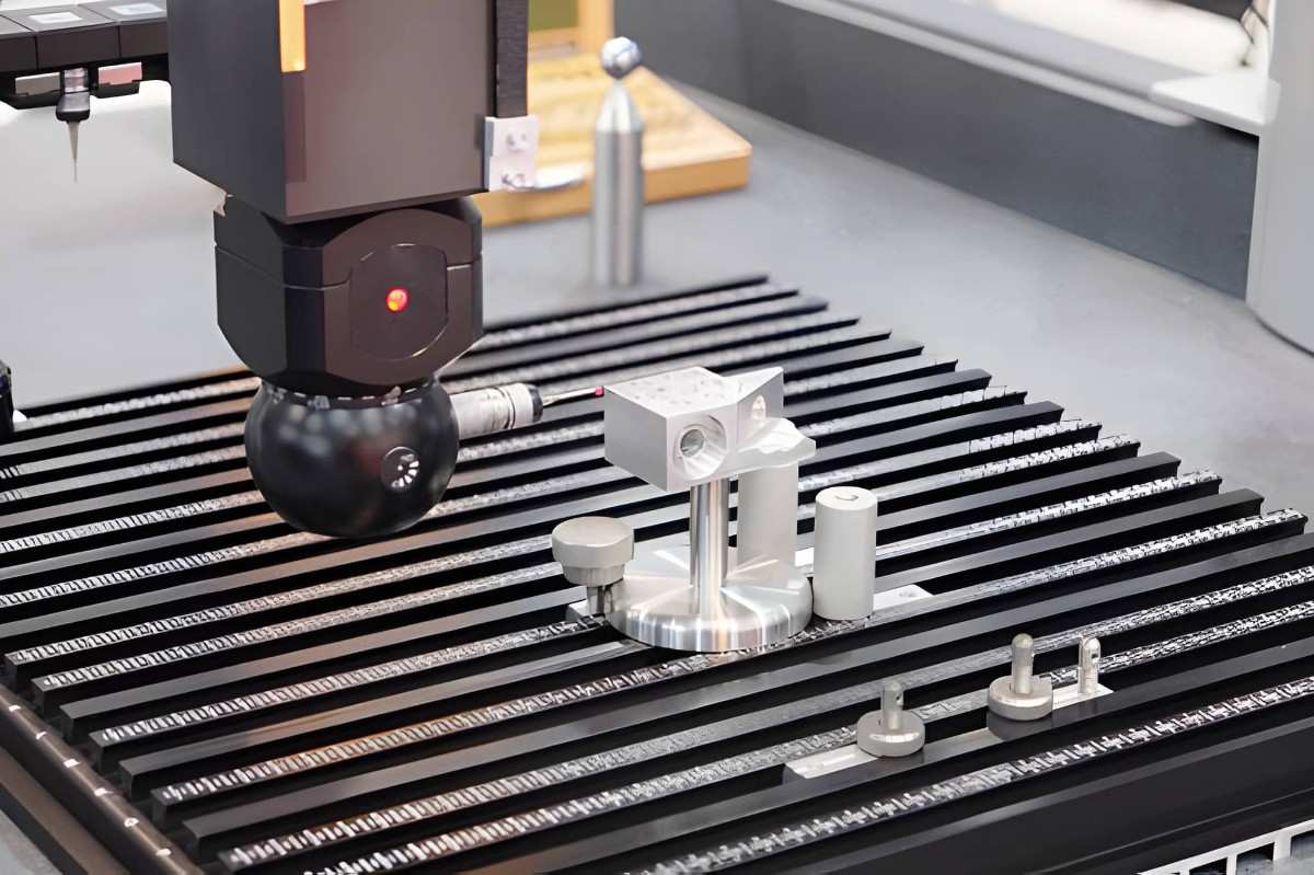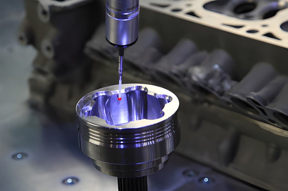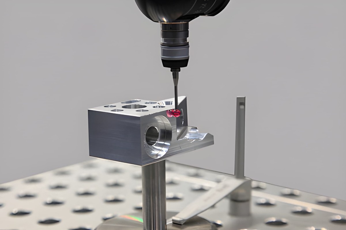 Image Description: A coordinate measuring machine checking a machined mechanical component using a touch probe to capture dimensional data.