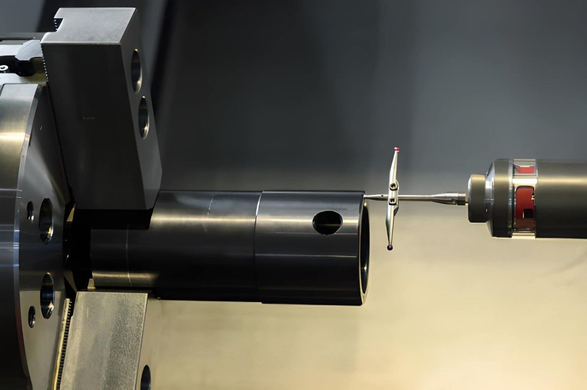 Image Description: A close-up of a CNC lathe with a touch probe inspecting a metal workpiece held in the chuck, demonstrating precise dimensional measurement during machining.