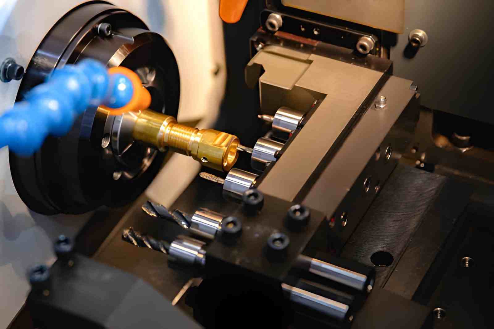 Description: The image shows a Swiss CNC lathe producing a cylindrical brass part. The brass workpiece is held in the sliding headstock while multiple tools perform turning and drilling operations.