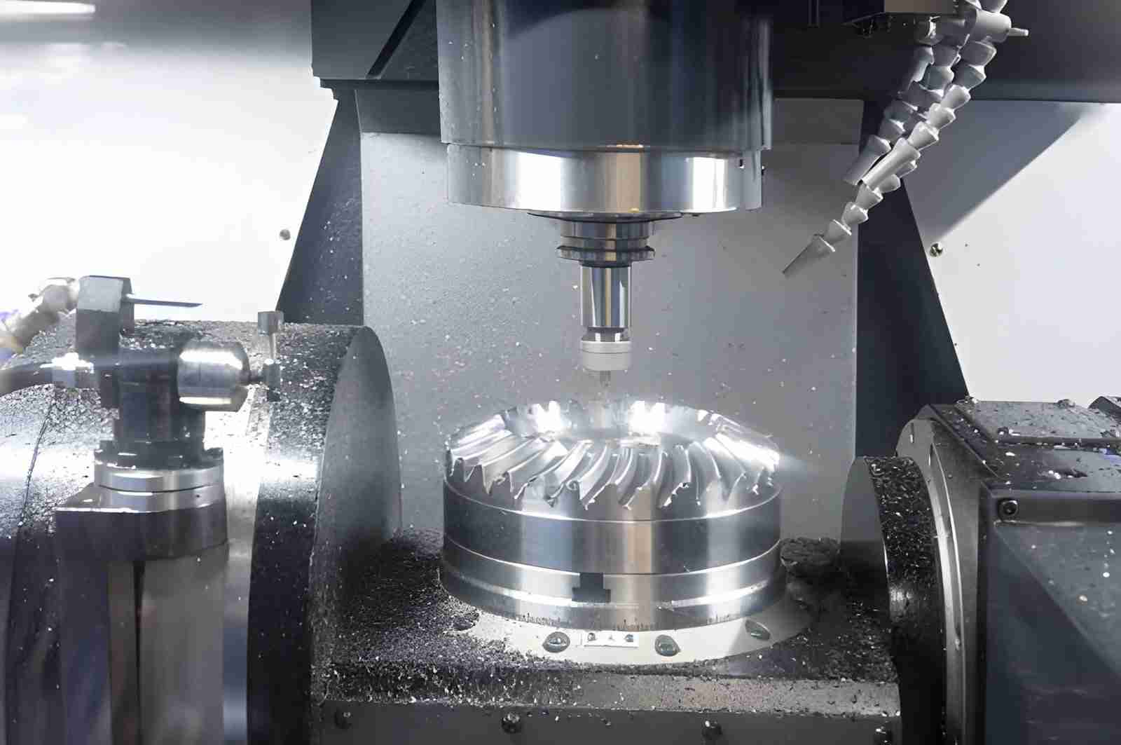 Image Description: The image shows a close-up of a 5-axis CNC milling machine shaping a precision aerospace part.