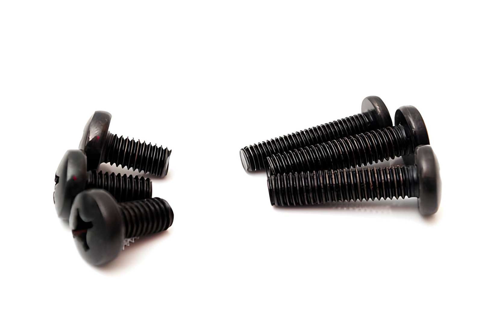 Image Description: The image shows steel screws finished with black zinc plating. The coating provides corrosion resistance and a uniform black surface commonly used in mechanical and industrial assemblies.