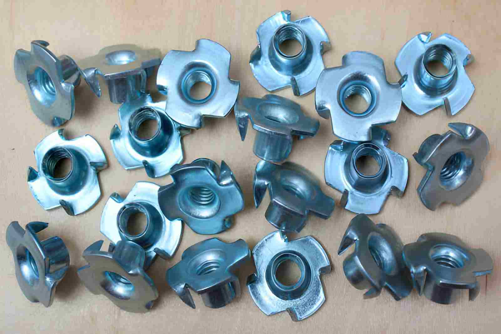 Image Description: The image shows steel pronged tee nuts with internal threads, finished with blue zinc plating.