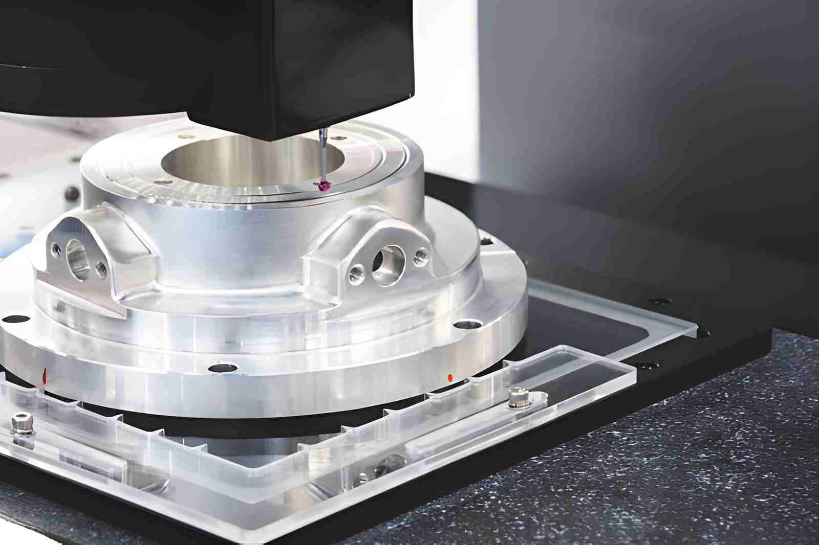 Description: Quality control on milling CNC machine with coordinate measuring inspection shows a CNC milling machine and a coordinate measuring machine positioned for dimensional verification. The machined metal part is placed on the measuring table, while a probe from the CMM is aligned to contact the specific part’s dimensions.